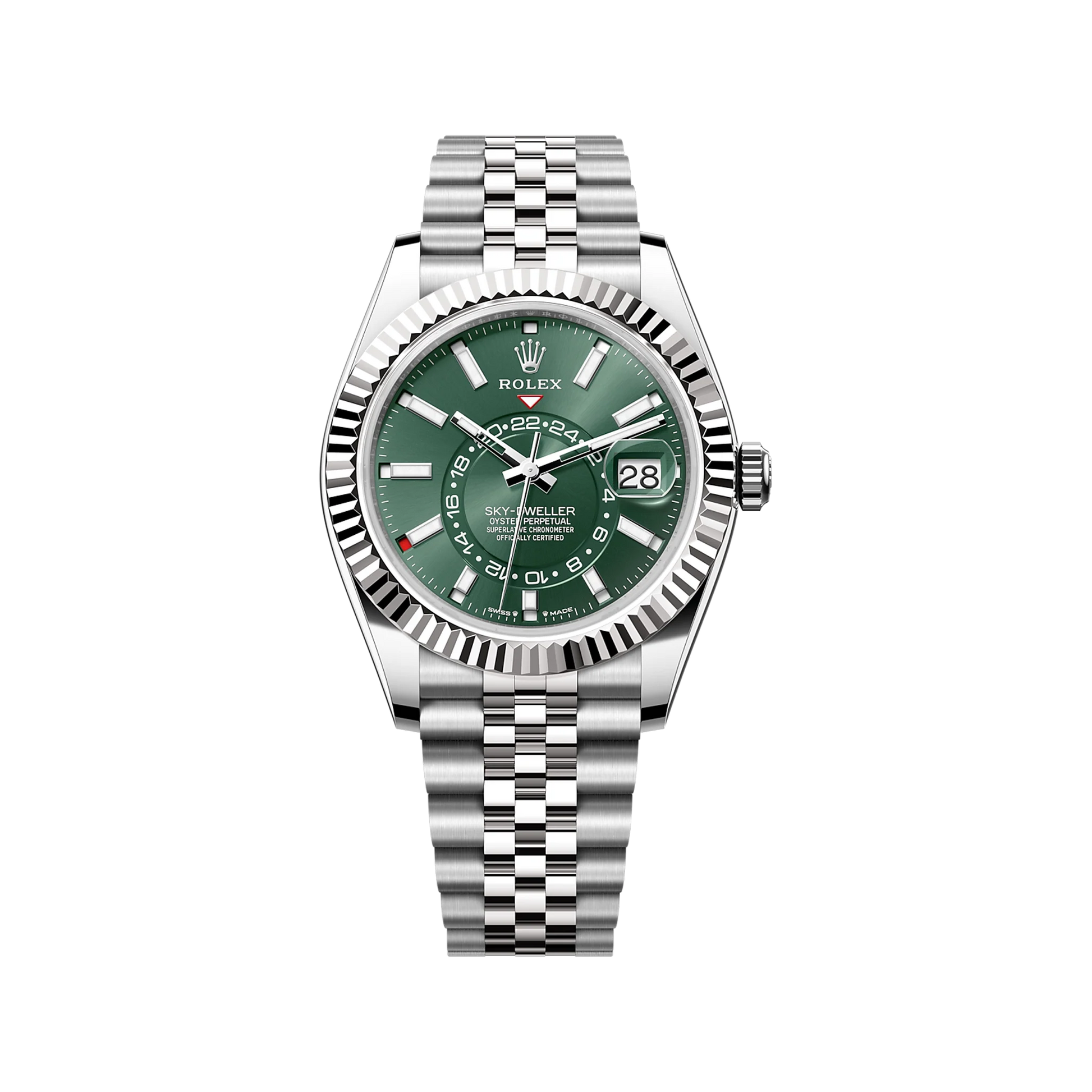 Rolex Sky-Dweller Steel Jubilee Green Dial 42mm ref. 336934-0002, a sophisticated timepiece designed for the global traveler. Crafted in Oystersteel and white gold, this watch features a striking mint green dial, which showcases a unique 24-hour display for tracking a second time zone. Key highlights include a deep red rectangle indicating the current month, part of the innovative Saros annual calendar that requires only one adjustment each year. The watch is powered by the self-winding Caliber 9002 movement with a 72-hour power reserve. The iconic fluted bezel not only enhances its aesthetic appeal but also contributes to its waterproof design. The Jubilee bracelet, with its five-piece links and Easylink comfort extension, ensures a comfortable fit. Water-resistant up to 100 meters, the Rolex Sky-Dweller combines functionality with luxury, making it an essential accessory for any discerning traveler.
